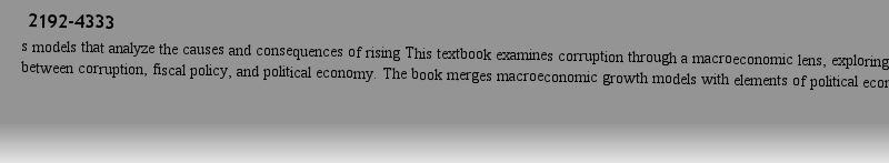 | 书目名称 | The Macroeconomics of Corruption | | 副标题 | Governance and Growt | | 编辑 | Maksym Ivanyna,Alex Mourmouras,Peter Rangazas | | 视频video | http://file.papertrans.cn/914/913402/913402.mp4 | | 概述 | Examines corruption through a macroeconomic lens, exploring the relationship between corruption, fiscal policy, and political economy.Applies models that analyze the causes and consequences of rising | | 丛书名称 | Springer Texts in Business and Economics | | 图书封面 |  | | 描述 | This textbook examines corruption through a macroeconomic lens, exploring the relationship between corruption, fiscal policy, and political economy. The book merges macroeconomic growth models with elements of political economic theory to address important applied topics such as income inequality within and across countries, growth slowdowns, and fiscal crises. Most of the basic ideas are illustrated using a two-period model of government investment that captures the future cost of policies that favor the present (Chapters 2-3). The more subtle and advanced issues are illustrated and, in some cases, quantified, using the overlapping-generations model of economic growth (Chapters 4-6). The models used to illustrate the mechanisms of economic growth are extended to incorporate politics and the behavior of public officials (Chapters 3, 5-7). The text concludes with a thorough discussion of policy reforms designed to address the issues discussed in earlier chapters. Intended for studentsfamiliar with intermediate-level economics, the book contains a technical appendix, including detailed explanations of each model, end-of-chapter questions and problems, and a complete solutions manual | | 出版日期 | Textbook 20181st edition | | 关键词 | macroeconomics; corruption; economic policy; fiscal policy; political economy; growth; income inequality; e | | 版次 | 1 | | doi | https://doi.org/10.1007/978-3-319-68666-0 | | isbn_softcover | 978-3-319-88636-7 | | isbn_ebook | 978-3-319-68666-0Series ISSN 2192-4333 Series E-ISSN 2192-4341 | | issn_series | 2192-4333 | | copyright | Springer International Publishing AG 2018 |