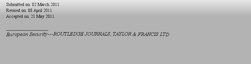 | 期刊全称 | European Security | | 期刊简称 | EUR SECUR | | 影响因子2024 | 2.732 | | 视频video | http://file.papertrans.cn/10/9394/9394.mp4 | | ISSN | 0966-2839 | | eISSN | 1746-1545 | | 出版商 | ROUTLEDGE JOURNALS, TAYLOR & FRANCIS LTD | | 发行地址 | 2-4 PARK SQUARE, MILTON PARK, ABINGDON, ENGLAND, OXON, OX14 4RN | | 学科分类 | 1.Social Sciences Citation Index (SSCI)--Area Studies | International Relations | Political Science; 2.Current Contents Social And Behavioral Sciences--Political Science & Public Administration; 3.Essential Science Indicators--Social Sciences, General; | | 出版语言 | English |