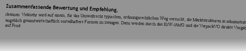n Jahren ein Entsorgungsnotstand drohte, stehen heute durch die vermehrte Nutzung von Müllverbrennungsanlagen und des dualen Systems wieder genügend Entsorgungs- und Recyclingkapazitäten bereit, so dass das Ziel, durch die Schaffung einer „neuen“ Produktverantwortung einen tatsächlichen Rückgang der