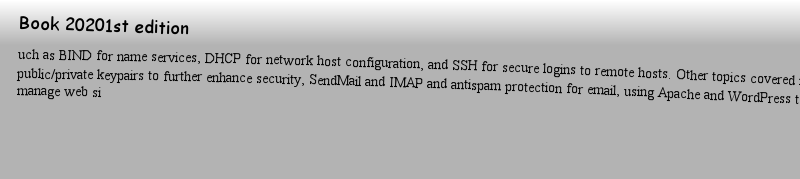 | 书目名称 | Using and Administering Linux: Volume 3 | | 副标题 | Zero to SysAdmin: Ne | | 编辑 | David Both | | 视频video | http://file.papertrans.cn/945/944649/944649.mp4 | | 概述 | Final volume of a complete Linux self-study course.Use your existing Linux power user skills to become an expert user of the Linux operating system.Work with multiple VMs on a single physical host to | | 图书封面 |  | | 描述 | .Manage complex systems with ease and equip yourself for a new career. This book builds upon the skills you learned in Volumes 1 and 2 of this course and it depends upon the virtual network and virtual machine you created there. .However, more experienced Linux users can begin with this volume and download an assigned script that will set up the VM for the start of Volume 3. Instructions with the script will provide specifications for configuration of the virtual network and the virtual machine. Refer to the volume overviews in the book‘s introduction to select the volume of this course most appropriate for your current skill level..Start by reviewing the administration of Linux servers and install and configure various Linux server services such as DHCP, DNS, NTP, and SSH server that will be used to provide advanced network services. You’ll then learn to install and configure servers such as BIND for name services, DHCP for network host configuration, and SSH for secure logins to remote hosts. Other topics covered include public/private keypairs to further enhance security, SendMail and IMAP and antispam protection for email, using Apache and WordPress to create and manage web si | | 出版日期 | Book 20201st edition | | 关键词 | linux sysadmin; system administration; system management; linux power user; sysadmin; open source systems | | 版次 | 1 | | doi | https://doi.org/10.1007/978-1-4842-5485-1 | | isbn_ebook | 978-1-4842-5485-1 | | copyright | David Both 2020 |