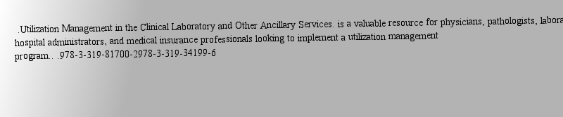 | 书目名称 | Utilization Management in the Clinical Laboratory and Other Ancillary Services | | 编辑 | Kent Lewandrowski,Patrick M. Sluss | | 视频video | http://file.papertrans.cn/945/944693/944693.mp4 | | 概述 | First dedicated text on utilization management in the clinical laboratory.Describes ways to establish utilization management programs for multiple specialties.Provides numerous examples of specific ut | | 图书封面 |  | | 描述 | .This book is the first comprehensive text on utilization management in the clinical laboratory and other ancillary services. It provides a detailed overview on how to establish a successful utilization management program, focusing on such issues as leadership, governance, informatics, and application of utilization management tools. The volume also describes ways to establish utilization management programs for multiple specialties, including anatomic pathology and cytology, hematology, radiology, clinical chemistry, and genetic testing among other specialties. Numerous examples of specific utilization management initiatives are also described that can be imported to other heath care organizations. A chapter on utilization management in Canada is also included..Edited by an established national leader in utilization management, .Utilization Management in the Clinical Laboratory and Other Ancillary Services. is a valuable resource for physicians, pathologists, laboratory directors, hospital administrators, and medical insurance professionals looking to implement a utilization management program.. . | | 出版日期 | Book 2017 | | 关键词 | utilization programs; laboratory formularies; physician profiling; test utilization; health care systems | | 版次 | 1 | | doi | https://doi.org/10.1007/978-3-319-34199-6 | | isbn_softcover | 978-3-319-81700-2 | | isbn_ebook | 978-3-319-34199-6 | | copyright | The Editor(s) (if applicable) and The Author(s), under exclusive license to Springer Nature Switzerl |
